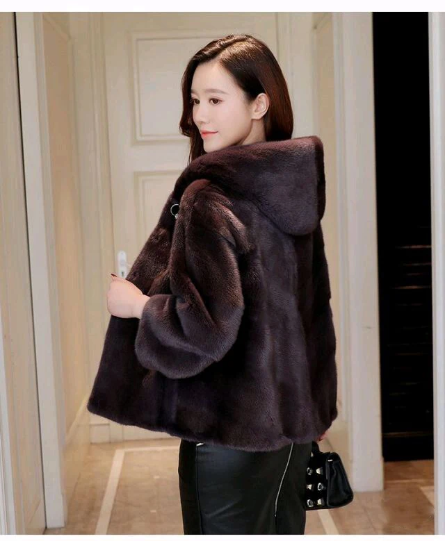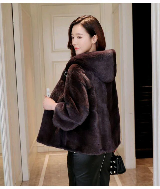 Manteau court en vison avec capuche en fourrure, chic et chaud pour l’hiver
