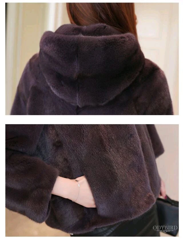 Manteau court en vison avec capuche en fourrure, chic et chaud pour l’hiver. Disponible du XS au XXXL.
